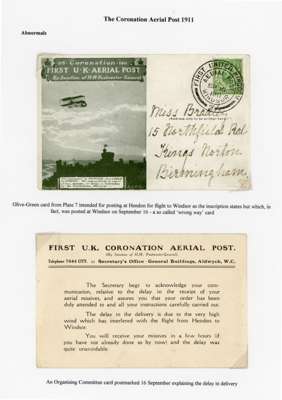 1911 FIRST UK AERIAL POST: exceptional usages or varieties; dark brown card printed using the plate used for envelopes (“Copyright” vertical in left hand margin), olive-green card inscribed for Hendon to Windsor flight but used “wrong way”, i.e. Windsor to Hendon, Organising Committee card explaining the delivery delay due to high winds etc. Condition varies. (4).
