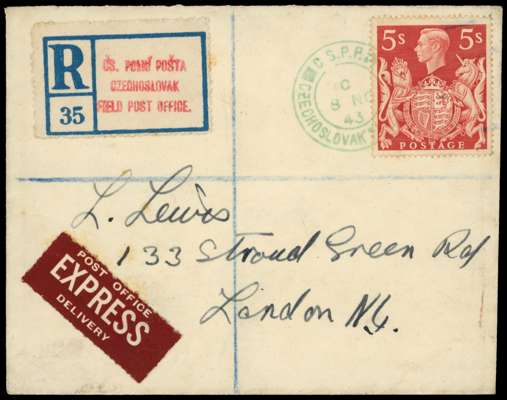 WW2 Czechoslovakian Army in London 1943 (8 Nov) registered express cover franked 5s red tied by green double-ring cds, registration label top left with three-line bilingual Field Post Office handstamp, two further green date stamps on reverse, very fine condition and most unusual with this value
