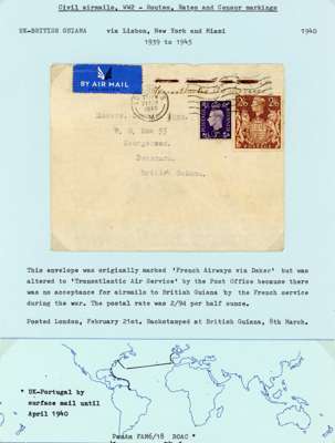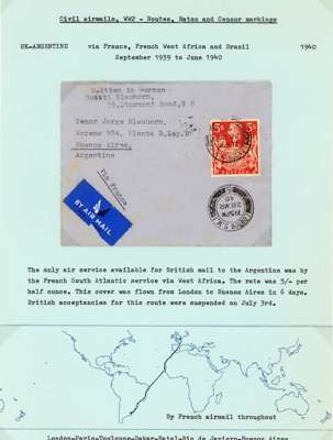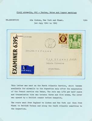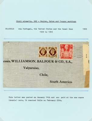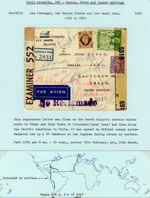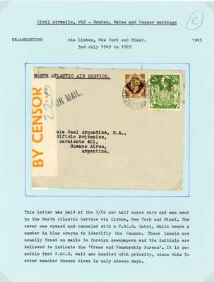 1940-44 group of covers to South America, all with ‘Square’ high values. 1940 (28 MR) to Argentina with 5s; 1940 (21 FEB) to Demerara with 2s6d brown + 3d; 1943 (1 SP) to Argentina with 2s6d green and 1s, orange P. & C.B. censor label; 1943 (15 FE) to Santiago with 3d, 1s and 2s6d. doubly censored, returned, with large purple NO RECLAMADO; 1943 (14 JA) to Chile with 5s and 1s pair; 1944 (13 MAY) to Argentina with 2s6d and 1s.
