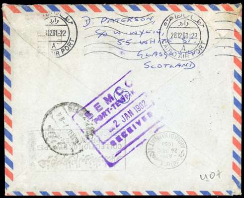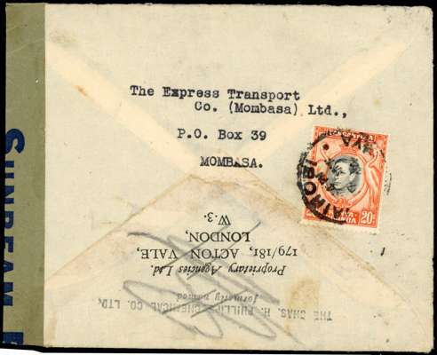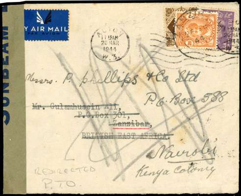 1944 cover to Zanzibar franked 3d and 1s values, redirected to Nairobi with Zanzibar 20c added; 20c KUT on reverse. Also 1961 cover from Glasgow to Kuwait, readdressed to Egypt with Kuwait 20f added.