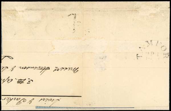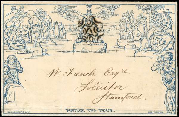 1840 2d Mulready lettersheet Forme 1, Stereo a91. Used example sent from London to Stamford, cancelled by a good strike of the London ‘7’ in Cross. Backstamped London and Stamford 3-4 AP 1843. Originally used as a wrapper; the side flaps are trimmed, there is some thinning on the reverse (clear of markings) and some creasing. A good-looking example of a rarity, of which few examples are known. Spec. ME3wg, £7,500.