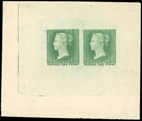 1871-1935 1d Die proof of the first (Later rejected) die. Very fine reprinted horizontal pair printed in yellow green on cream wove paper (83 x 70mm). Scarce. Spec. DP8d cat £12,000+.