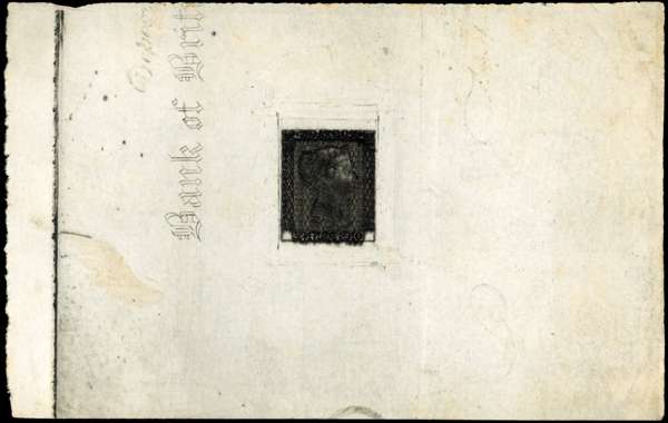 1840 (March) 1d Black Die Proof. Superb reversed impression die proof of the Penny Black with "Stars" added in the upper corners and blank letter squares at foot. Printed in black on thin bluish wove paper (85 x 134mm) with a slightly overinked appearance as usually seen. Pulled from a flat plate showing vertical guide lines outside the design with part etching in the margin "Deposi(t)/Bank of Briti(sh)". Produced prior to the transfer of the impression to the full plate, possibly to verify the alignment of the transfer roller. Light vertical crease in margin at right well clear of design not detracting from this magnificent and very rare proof. One of only two complete examples in private hands, a third example resides in the Royal Philatelic Collection. SG DP17c, from £75,000.