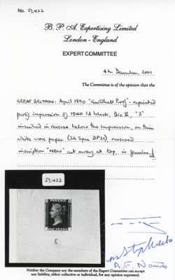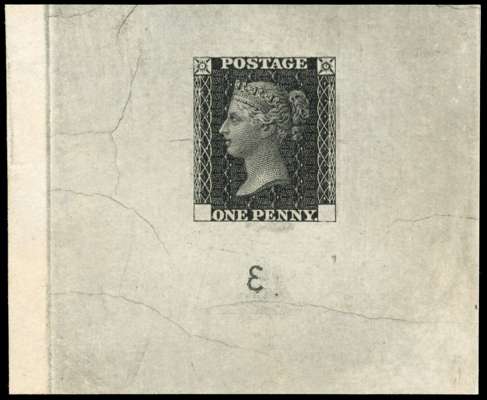 1890 1d "Guildhall" die proof printed in black on thin wove paper with "3" printed in reverse below the design and showing the typical overinking and die cracking of these 1890 prints. Inscription "New" cut away at top. Very Scarce. BPA Cert (2001), Spec. DP31 cat £10,000