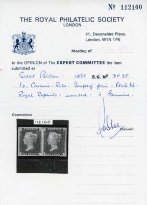 1865 1d carmine-rose "Royal Reprint" Plate 66 (LI-LJ), imperforate horizontal pair, large part o.g. Scarce. RPS cert (1979). Spec DP35b cat £4,500+