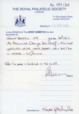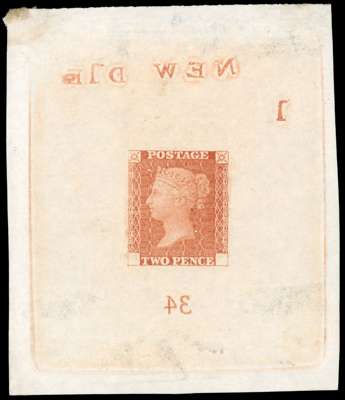 1871 2d Ormond Hill Die proof, endorsed ‘’NEW DIE'', ‘’1'' and ‘’34'' (reversed) in brownish orange, on thin hard yellowish wove paper (65x76mm). Typical contemporary paper buckling as is the nature of this very thin paper, otherwise fine, a very rare proof. RPS Cert (2008). Spec. DP46b cat £18,000