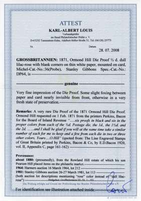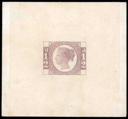 1871 ½d Ormond Hill Die Proof printed on thin hard yellowish white wove paper in dull lilac-rose, mounted on card (53 x 49mm). Very fine and rare. Karl Louis Certificate of Provenance (2008), SG DP64b cat £15,000.