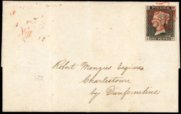 1840 entire letter to Charlestown, Dunfermline, bearing 1d grey-black Plate 1a (IF), four good to large margins, tied by crisp strike from red MC, typical filing folds, a most attractive cover. SG 3 cat £850 on cover.