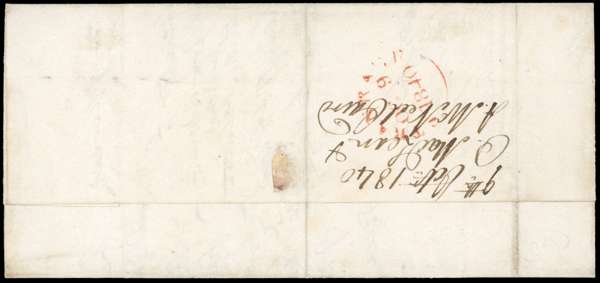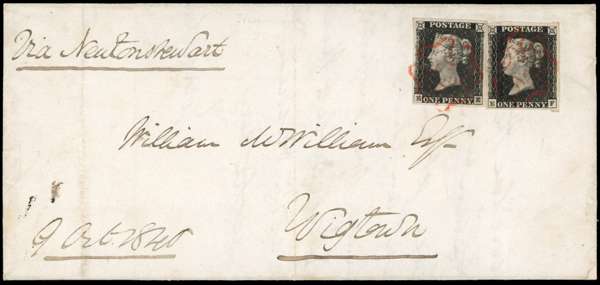 1840 1d black, two singles from plate 1b lettered ‘EE’ and ‘EF’, both good even margins, on cover to Wigton neatly tied by scarlet Maltese Cross of Stranraer, backstamped by red cds (9.10). Attractive. SG 2
