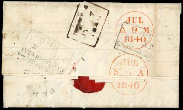 1840 1d black, plate 1B (TA), clear to good margins, on cover to Pitcaithly (near Perth) tied by red Maltese Cross and part ‘BRIDGE OF EARN’ boxed handstamp, ‘MISSENT /TO PERTH’ two-line handstamp alongside, then re-addressed from Dunkeld then again to Castle Douglas, backstamped with despatch, transit and arrival cancels; vertical filing folds clear of the adhesive. Most unusual and fine. SG 2