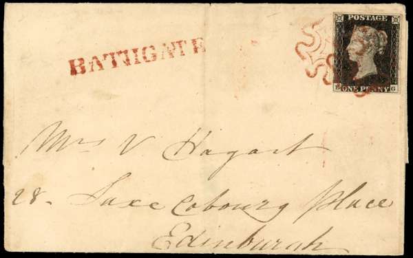 1840 1d black, plate 2 (EG), good to large margins, on cover to Edinburgh tied by double strike of the orange-brown Bathgate Maltese cross, alongside ‘BATHGATE’ straight-line handstamp, backstamped with Edinburgh (20.5) arrival cds; central filing fold clear of the adhesive. Good. RPS Certificate (1998). SG 2, Spec A1th
