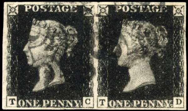 1840 1d intense black, plate 5 (TC-TD) horizontal pair, good to large margins, cancelled by black Maltese Crosses. Very fine. SG 1 cat £900+