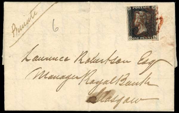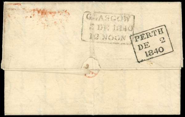 POSTAL HISTORY: 1840 1d black, plate 6 (OL), clear to very large margins, on cover to Glasgow tied deep red-brown Maltese cross of Perth, backstamped with Perth (2.12) despatch and Glasgow (2.12) arrival boxed hs; vertical filing fold clear of the adhesive. Most unusual and fine. SG 2