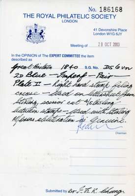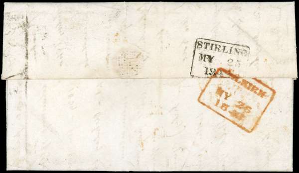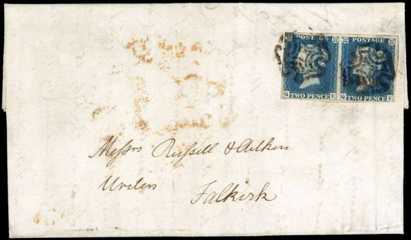 1840 2d blue, Plate 1, horizontal pair (QE-QF), just cut into at lower right to large margins and nearly severed between pair, on entire cover to Falkirk, both tied by the distinctive Stirling black Maltese Cross, backstamped by Stirling despatch for 25 MY 1842 and Falkirk arrival (26.5) boxed handstamp; refolded and a couple of vertical filing folds, one through the right stamp. A very rare cover. RPS Certificate (2003), SG Spec DS5vn