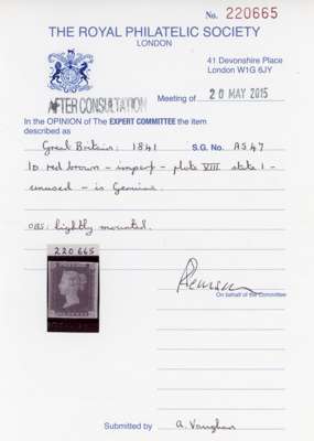 1841 1d Red brown Plate 8 (OL) from "Black" plates, with four good to large margins, mint, very lightly mounted o.g., and a wonderful example of this scarce stamp. The finest we have handled for many years. RPS Cert (2015) for former AS47, now Spec. AS51, £11,000.