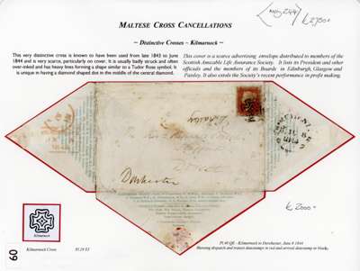 1841 1d red-brown, Plate 40 (QE), good even margins, on printed advertising cover to Dorset, tied by rare distinctive Kilmarnock Maltese Cross, backstamped by despatch boxed h/s for JN 6 1844 and Dorchester single arc ds for 8 JU. The cover opened for display and with some faults, still an unusual item. SG 8