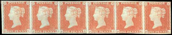 Great Britain 1841 1d Pale red brown Pl.126 strip of six, SG 9 mint