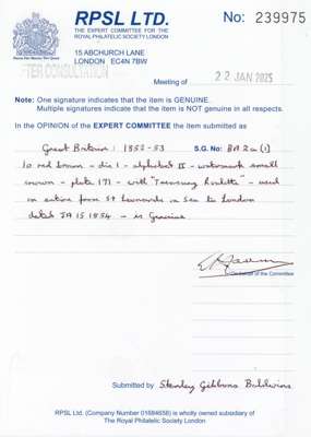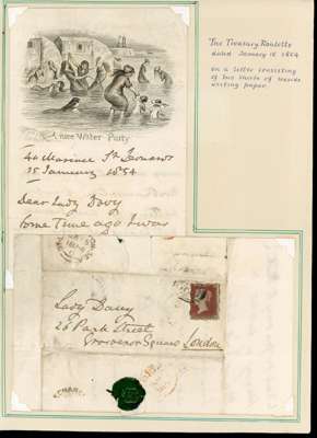 1852-53 1d red-brown Plate 171 (Die I, Alphabet II) with ‘Treasury Roulette’ used on entire letter with printed scenes one of bathing and the other aboard ship, addressed to London cancelled by St Leonards-on-Sea ‘682’ obliterator, backstamped with dispatch for ‘JA 15 1854’ and London arrival on the same day; adhesive creased and cover with peripheral faults. A most unusual and appealing cover. RPS Certificate (2025). SG 8i; Spec. B2a cat £15,000 on cover.