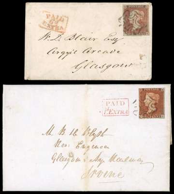 1841 1d red-brown, two covers from Edinburgh tied by black Maltese crosses, with alongside red boxed ‘PAID/1d.EXTRA’ and scarce ‘PAID/6d/EXTRA’ handstamps, backstamped accordingly; the former with vertical filing fold and the latter adhesive small fault at foot. A most unusual pair. SG 8