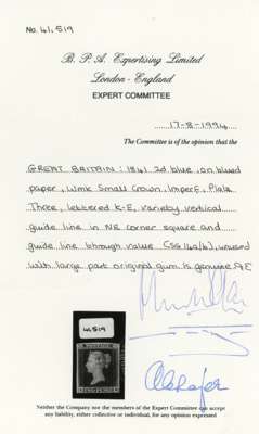 1841 2d blue, plate 3 (KE), close to good margins, mint with large part o.g. showing guide lines in north-east square and through value. Fine. BPA Certificate (1994). SG 14b cat £3500