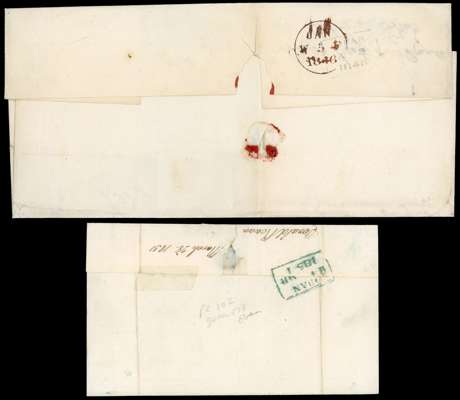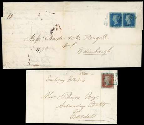 1841 2d blue, Plate 3 horizontal pair (JC-JD), large to enormous margins showing parts of next stamps, on cover tied by blue barred ‘273’ numeral of Oban, backstamped with boxed (1.3.46) handstamp and Edinburgh (5.1) arrival cds and 1841 1d red-brown, plate 102 (OJ), good to enormous margins, on large piece tied by inverted ‘273’ blue-green numeral, backstamped by Oban (25.3.51) boxed despatch; both have filing folds away from the adhesives. An unusual pair. SG 8, 14