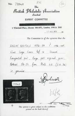 1857 1d rose-red Plate 42 (JB) perf 16, mint small part o.g., a couple of diagonal creases and short perf at foot and some toned perf tips, otherwise fine. Accompanied by photocopy of BPA cert. (1973) certifying the pair from which this single was taken. SG 36 cat £2800