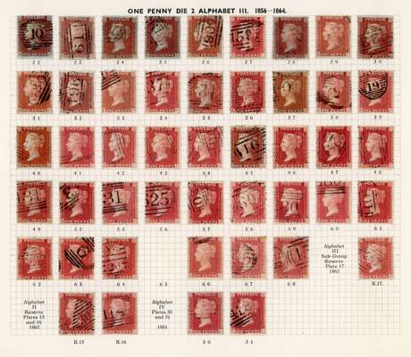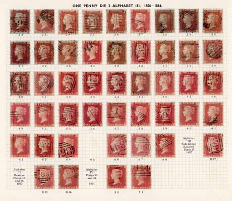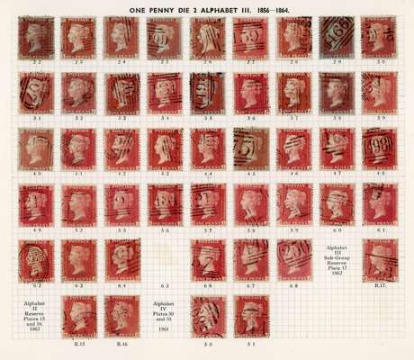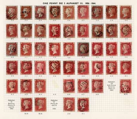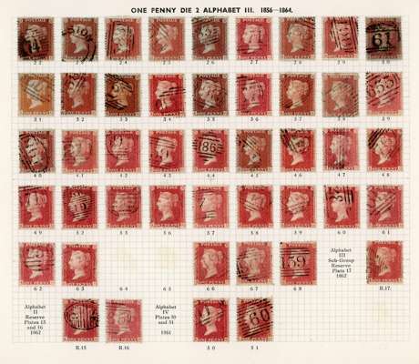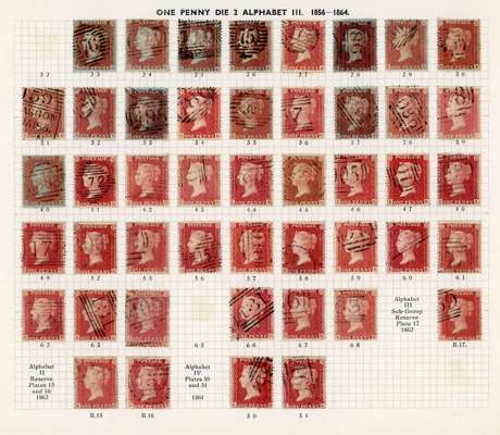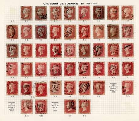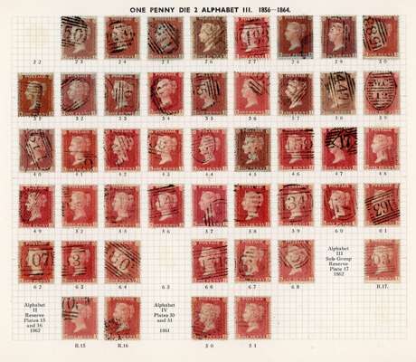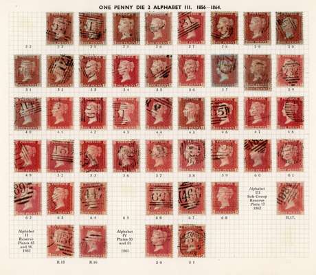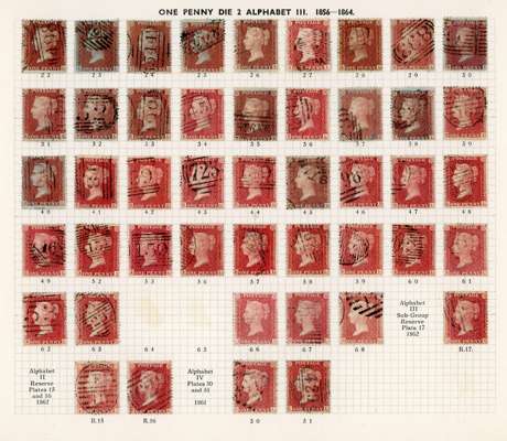 GB 1856-64 1d reds from Plates 22 - R17, the E Row