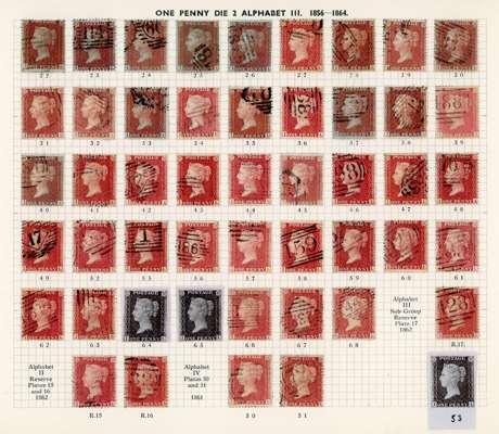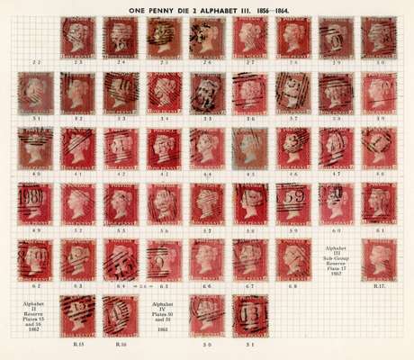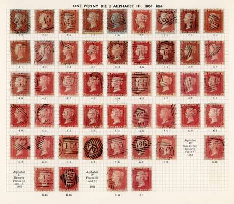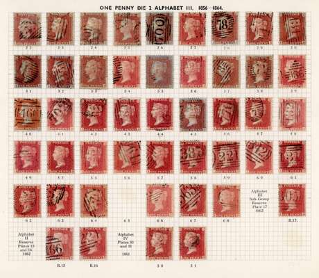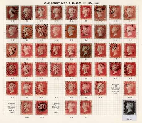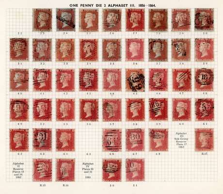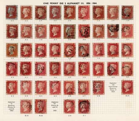 1856-64 1d reds twelve sheets being the I row from the Wiggins plating book of Alphabet III, plates 22-68 plus R15-R17. 562 stamps out of a possible 576 are present, so missing 14. Included are 8 from 22, 9 from 64 and 5 from 65 (two with RPS certificates). All of these rarer plates are believed correct (they alone catalogue £14,250). Chiefly fine. Spec.C8-C13.