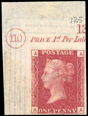 1864-79 1d rose-red Plate 110 (AA) imperforate imprimatur, the upper left corner example showing Plate number ‘110’ and partial marginal inscription, unused, very fine and rare, one of only two corner examples in private hands. SG 43