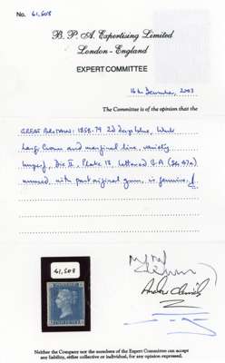 1858-79 2d deep blue, Plate 13 (BA), the imperforate variety, four close to good margins, mint, part o.g. and fine. BPA cert (2003). SG 47a, £7,500.
