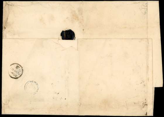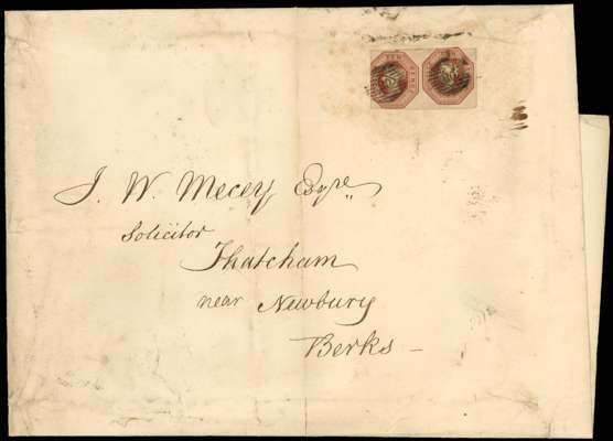 1847-54 10d brown horizontal pair (cut into to large margins), on large entire to Thatcham, tied by '20' numeral for Greenwich, the reverse with 'MR 30/1852' despatch and Newbury MR 31 arrival cds. Some faults to the entire, still a rare and most unusual franking. SG 57.