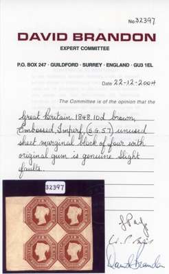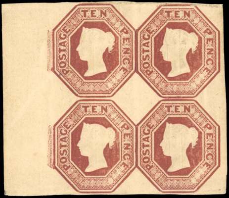 1847-54 10d brown, four-margined left-marginal block of four, mint, large part o.g., some light creases and splitting between the horizontal pairs, nevertheless a magnificent block of the highest rarity. Brandon cert (2004), SG 57, £30,000+.