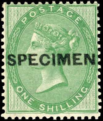 1856 1s deep green, optd “SPECIMEN” type 4 mint part o.g. Lovely deep colour. SG 71s cat £1000