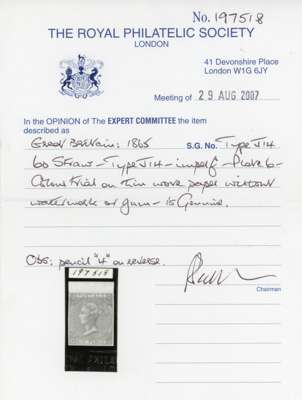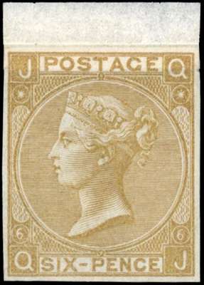 1867 6d Plate 6 (QJ) colour trial in straw, imperforate upper marginal example on unwatermarked, ungummed thin wove paper, one of two known in private hands. RPS cert (2007), For SG 97.