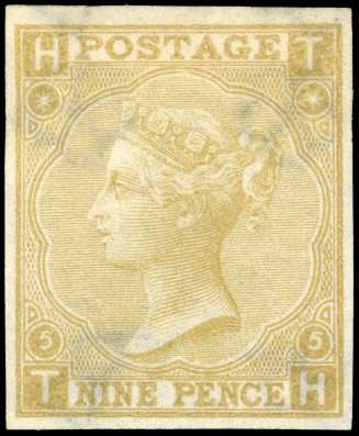 1865 9d straw Plate 5 (TH), wmk. Emblems, imperforate imprimatur, without gum. SG 98var cat £15,000.