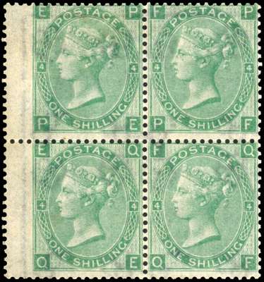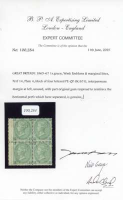 1865-67 1s green, Plate 4 (PE-QF) in block of four, with wing margin at left, mint, part o.g. which has been redistributed to reinforce the separated horizontal perfs, still a very scarce multiple. BPA Cert (2025), SG 101 cat £11,400+