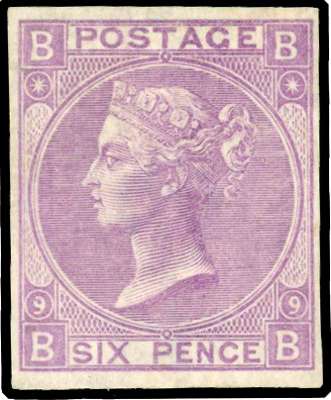 1870 6d mauve Plate 9 (BB) imperforate, fine unused. One of the great surface-printed rarities, of which only three other examples are recorded in private hands (AA,AB & AC). SG 109a cat £5,000