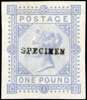 1878 £1 Plate 1 (CB) imperforate colour trial in blue on gummed wmkd paper, optd ‘SPECIMEN’ type 9, mint part o.g. fine and scarce. SG 129var cat £2,700