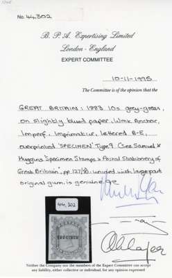 1883 10s Grey green Plate 1 (BE), (Wmk. Anchor), imperforate imprimatur on slightly blued paper, optd "SPECIMEN" type 9, large part o.g. Very rare, one of only 8 possible examples many of which are in institutionalised collections. A magnificent example of this rarity. BPA Cert (1995), SG 131var cat £46,000.