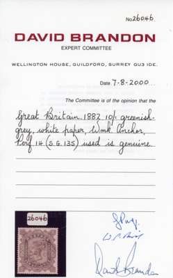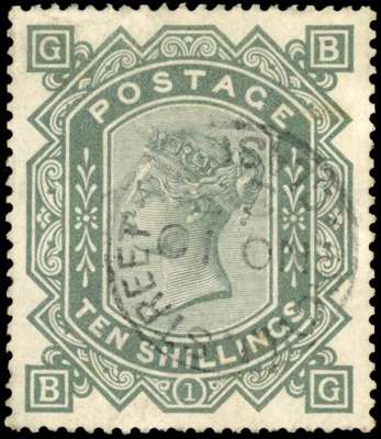 1867-83 Anchor watermark, 10s grey-green (BG), light cancelled by neat Glasgow cds; creased but with excellent centering; a good example. Brandon opinion (2000). SG 135 cat £3500