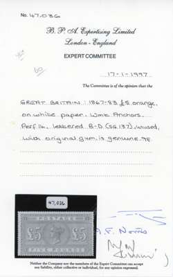 1867-83 £5 orange, white paper (BD), mint unmounted o.g. Fine colour and lovely gum. BPA Certificate (1997). SG 137 cat £10,000