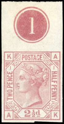 1873-80 2½d rosy mauve Plate 1 (AK), very fine top marginal imperforate imprimatur showing plate number “1", mint unused o.g. Very rare, unique in private hands. SG 138var.
