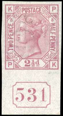 1873-80 2½d Rosy-mauve Plate 8 (PK), lower marginal imperforate imprimatur showing current number "531", mint large part o.g. A magnificent and unique positional example, the other current number example AB remains on the imprimatur sheet in the Postal Museum archives. SG 141var.