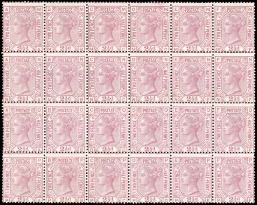 1873-80 2½d Rosy mauve Plate12 block of 24 (MA-PF), fine and fresh mint unused o.g. (22 stamps unmounted o.g.). A couple of small imperfections as to be expected with such a multiple, nevertheless a very rare and attractive piece. SG 141 cat £9,600+.
