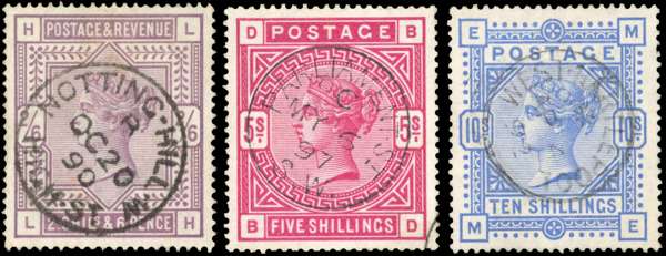 GB: 1883/84 white paper 2s6d (LH), 5s (BD) and 10s (ME), all well centered and neatly cancelled by cds