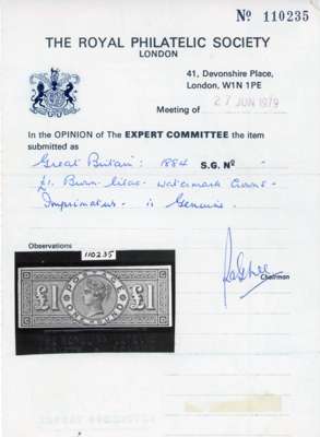 1884 £1 Brown-lilac Plate 2 (GD), imperforate imprimatur, large part o.g. Very rare, one of only 33 possible examples many of which are in institutional collections. RPS Cert (1979). SG 185var cat £15,000.