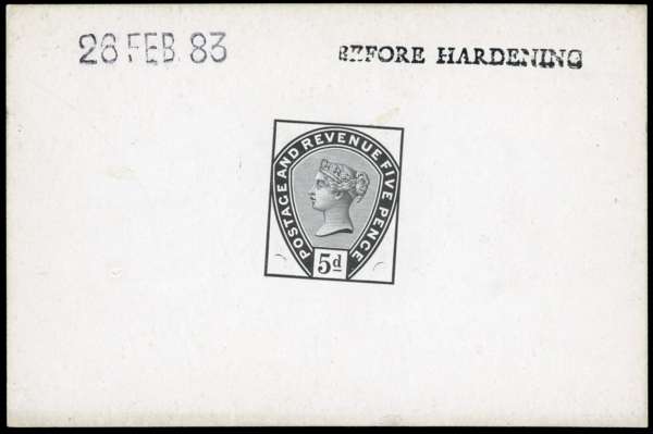 1883 5d die proof (Unissued design with line under "d"), printed in black on white glazed card (92 x 60mm) dated "26 FEB 83" and endorsed "BEFORE HARDENING". Very fine and scarce. SG 193var cat £3,500.