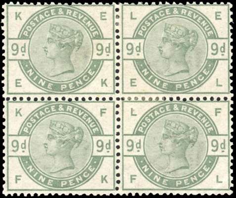 1883 9d dull green, block of four (EK-FL), mint, large part o.g., 'FL' with corner crease, otherwise fine with lovely colour. A rare multiple. SG 195 cat £3,000+.