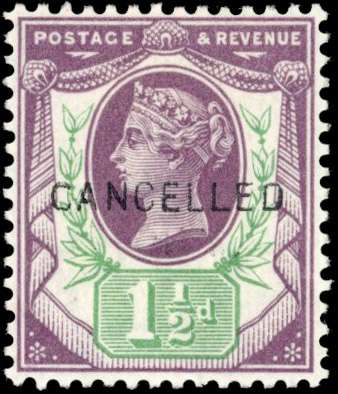 1887-1892 1½d dull purple & green "Jubilee". Very fine and fresh mint large part o.g. example optd "CANCELLED" type 14. Scarce. SG 198var, Spec. K29t cat £1,250.