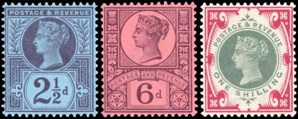 GB: 1887-1900 2½d purple on blue, 6d purple on rose-red and 1s green and carmine; all mint unmounted og